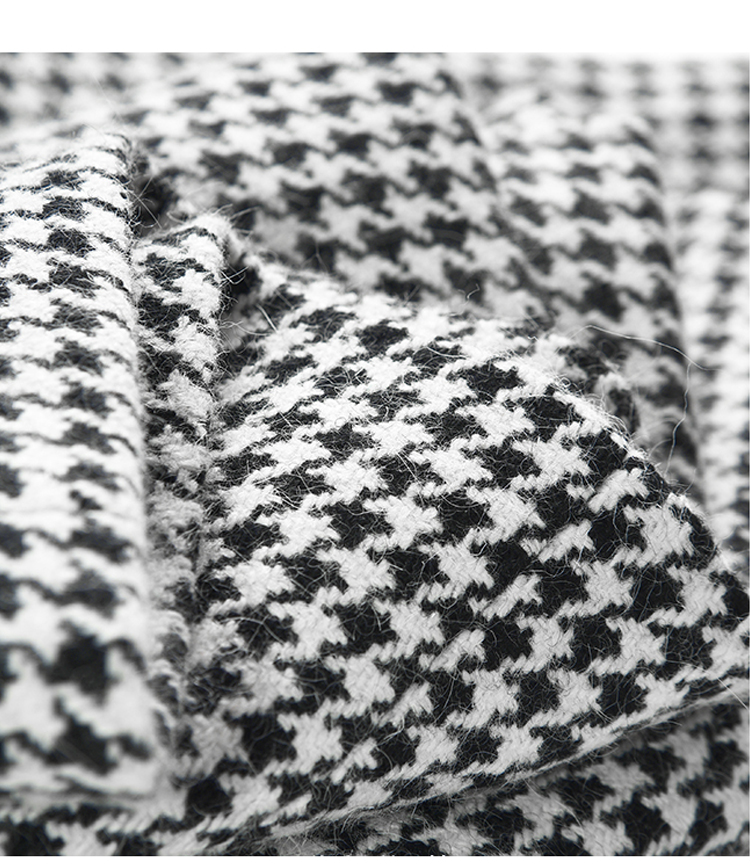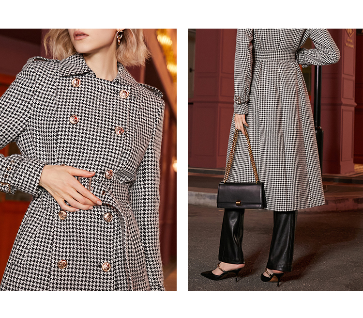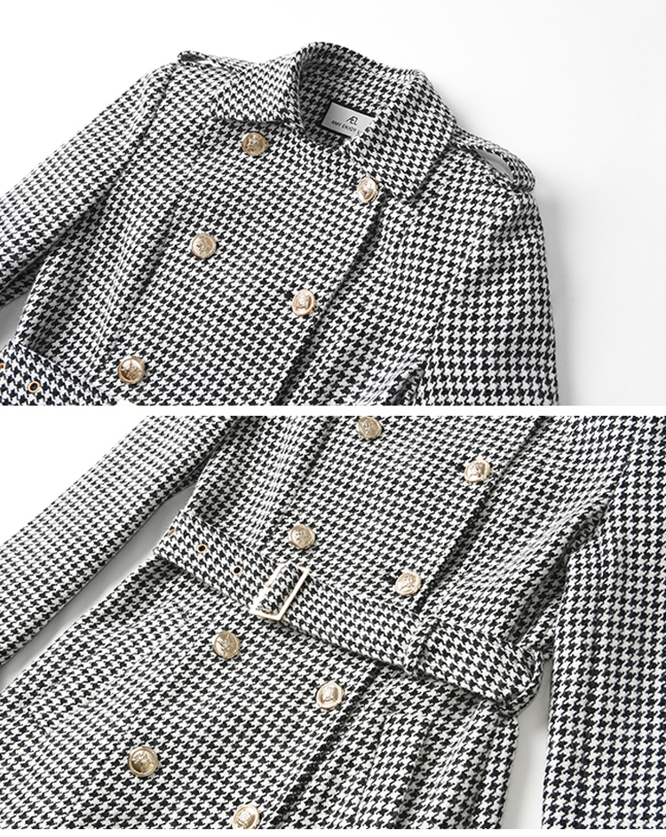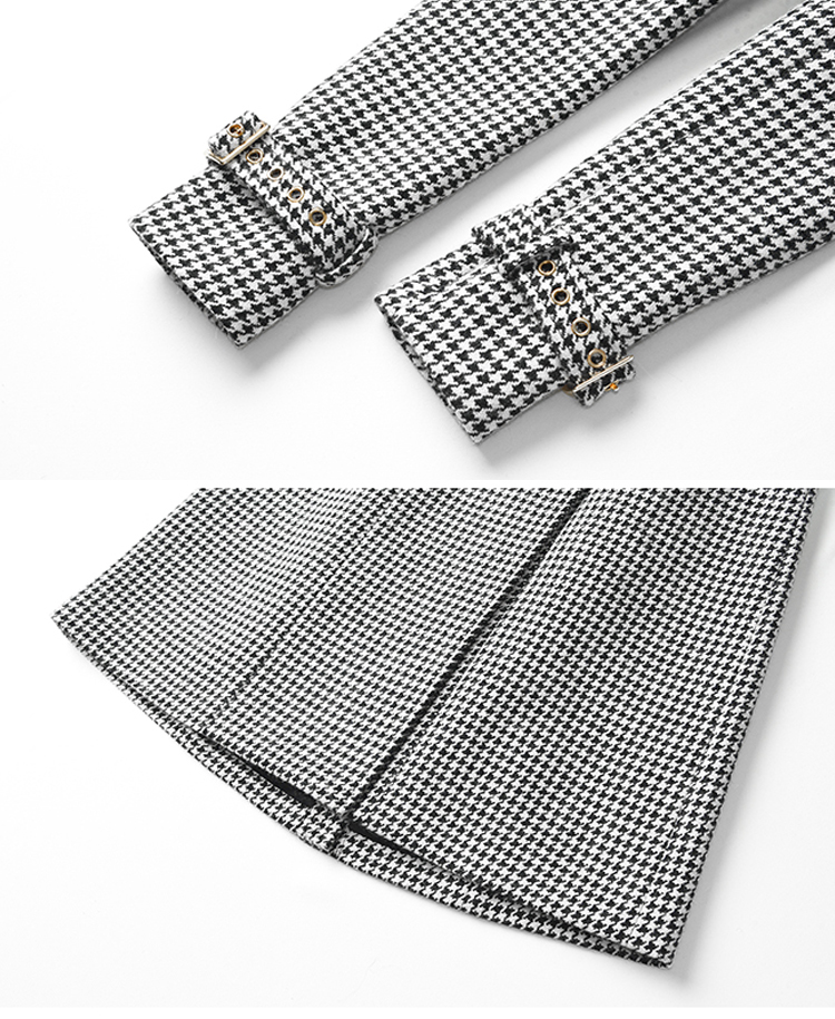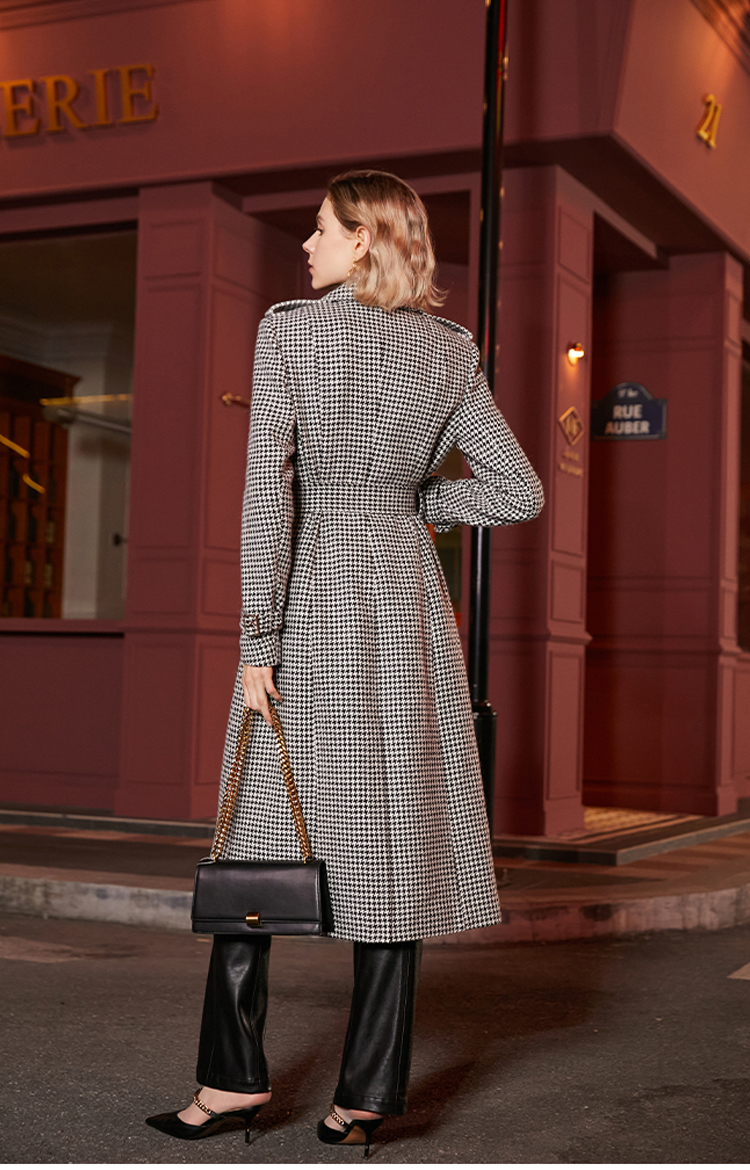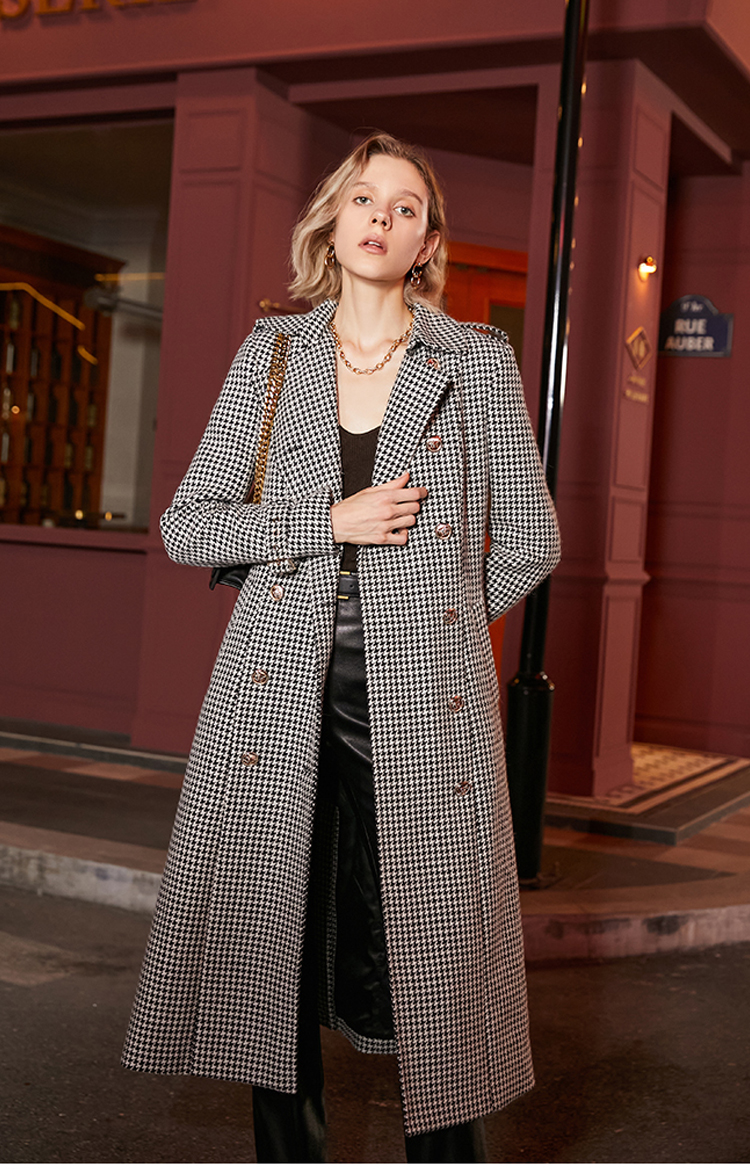 Winter Wool Long Coat Women Retro Houndstooth A-Line Trench Coats